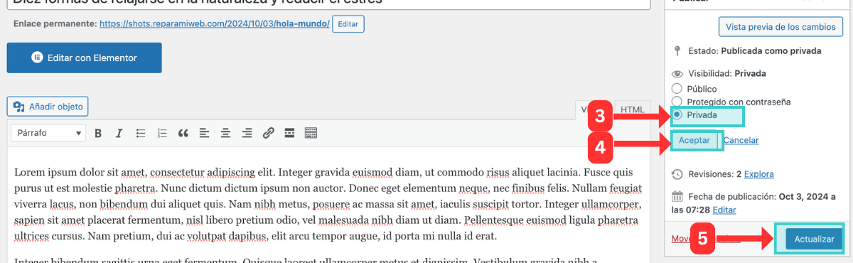 5. Finalmente, guarda los cambios con «Actualizar» o «Publicar» si es una nueva entrada.