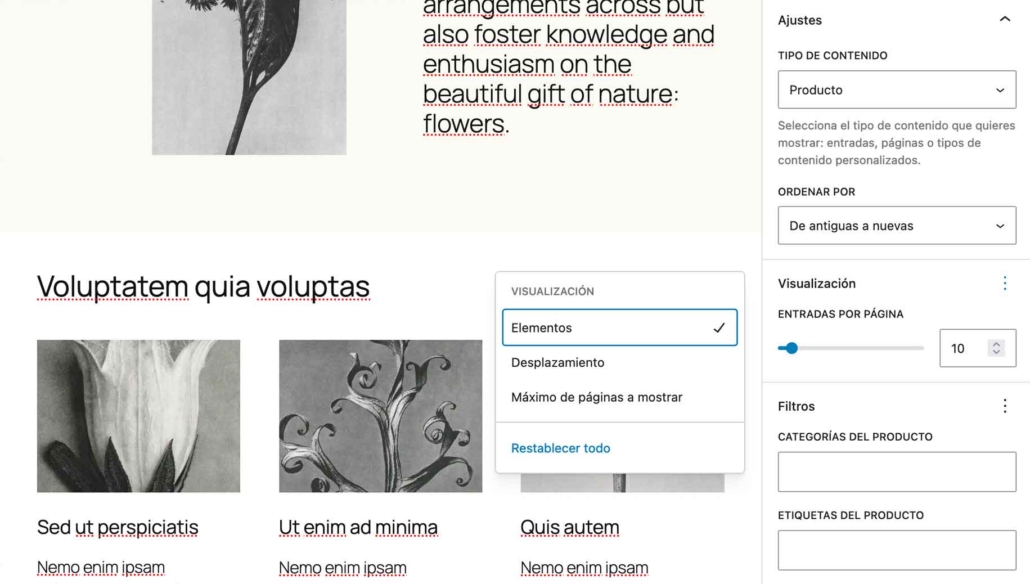Puedes filtrar contenido por categorías, etiquetas, fechas o campos personalizados. Esto es útil para crear secciones como «Lo más reciente», «Entradas populares» o «Productos destacados» sin necesidad de código.