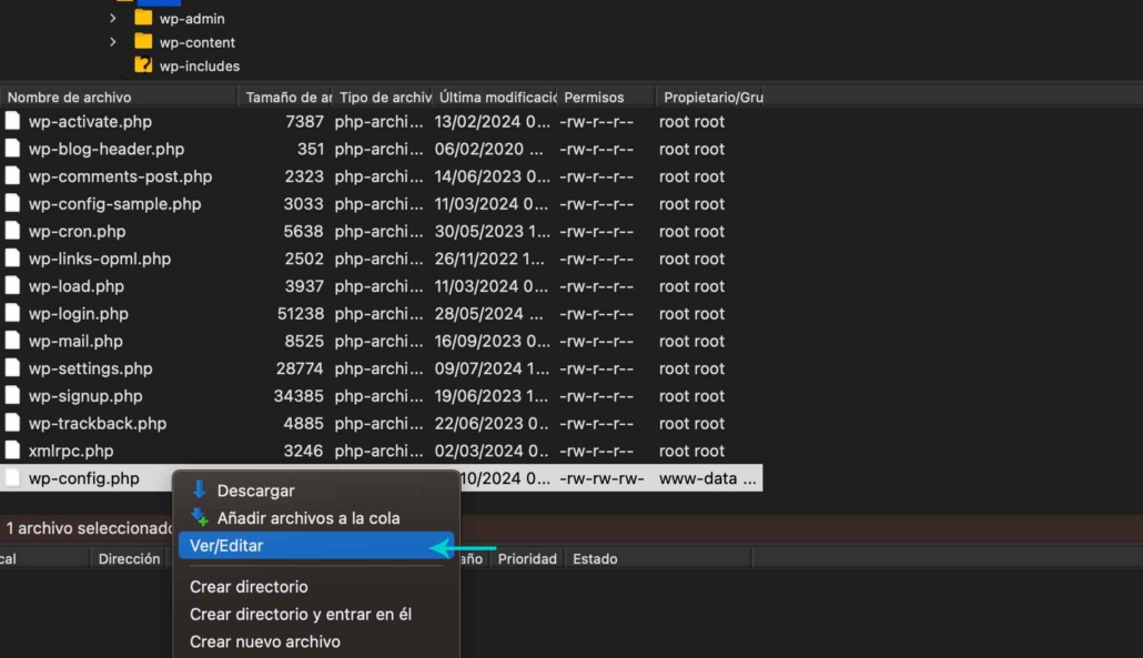 Una vez conectado, dirígete a la carpeta raíz de tu instalación de WordPress, que es donde generalmente se encuentra el archivo wp-config.php. Abre este archivo con un editor de texto para hacer las modificaciones necesarias.