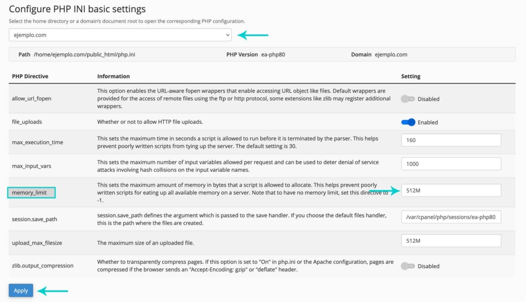 Finalmente, después de realizar los ajustes necesarios, desplázate hacia la parte inferior de la página y haz clic en «Apply» para guardar los cambios. Esto actualizará la configuración de PHP para tu dominio, aplicando el nuevo límite de memoria.